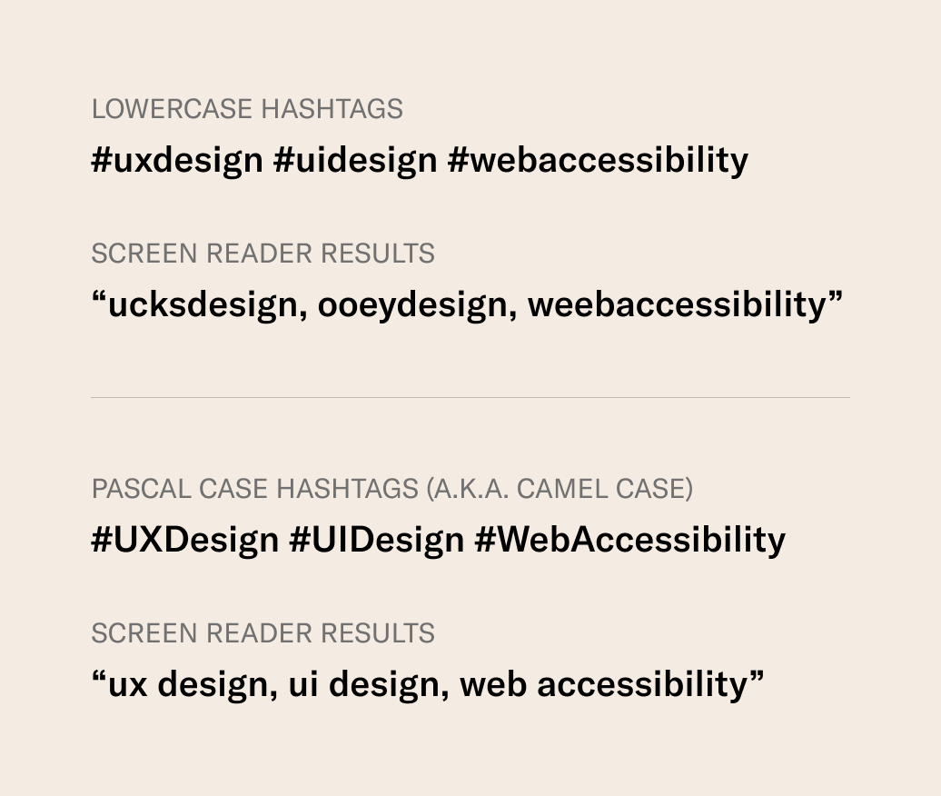 Every hashtag on every post on every platform should ALWAYS be pascal case. I wrote this to illustrate how screenreaders read hashtags based on their case.