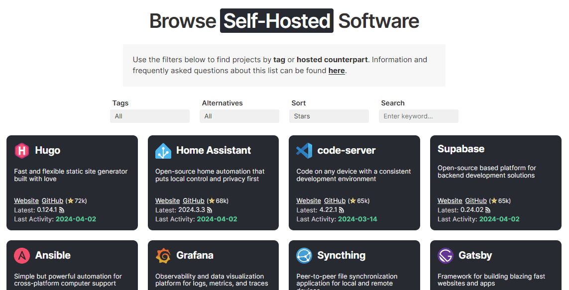 It's a supplemental tool to Awesome-Selfhosted and meant to be an alternate view focused on details that I personally find more relevant. And more importantly - it'll always be up-to-date as it's built on the dataset I use to monitor updates and releases for This Week in Self-hosted.